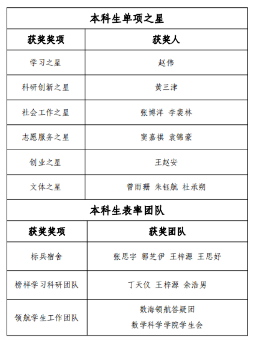 11月16日,2022年“数学之星”评选正式启动。经“数学之星”评审委员会函评与学院内公示, 赵伟、黄三津、窦嘉祺、王浩天、姜亦申、刘泽蕙等15人获评单项之星,数海领航答疑团等6支团队获评表率团队,许多、李泽彤、岳泽阳、陈永鑫、于晟伟、穆欢等29人获评优秀奖,beats365亚洲体育投注学生会等6支团队获评优秀团队。