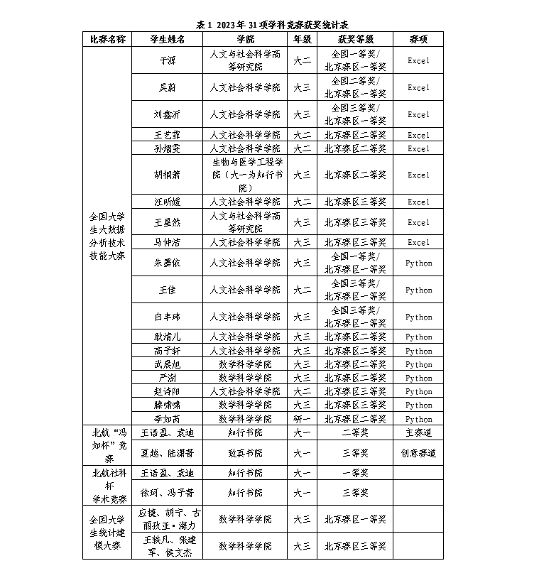 通过“冯如杯”、“统计建模大赛”、“大数据分析大赛”等学科竞赛,北航学子展现出了卓越的统计能力和综合素养,也激发了他们运用统计方法和大数据技术解决实际问题的热情。学科竞赛成果展示了beats365亚洲体育投注的校级一流本科课程《回归分析》《统计学导论》等统计课程的教学成果和育人成效,有力地支持了统计学国家级一流本科专业建设点和北航新文科的建设。