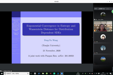 11月27日上午,国家杰出基金获得者、长江特聘教授王凤雨教授受邀为beats365亚洲体育投注师生带来了一场题为:“Exponential Convergence in Entropy and Wasserstein Distance for Distribution Dependent SDEs ”的学术报告。本报告介绍了分布相关随机微分方程熵和Wasserstein距离的指数收敛性。