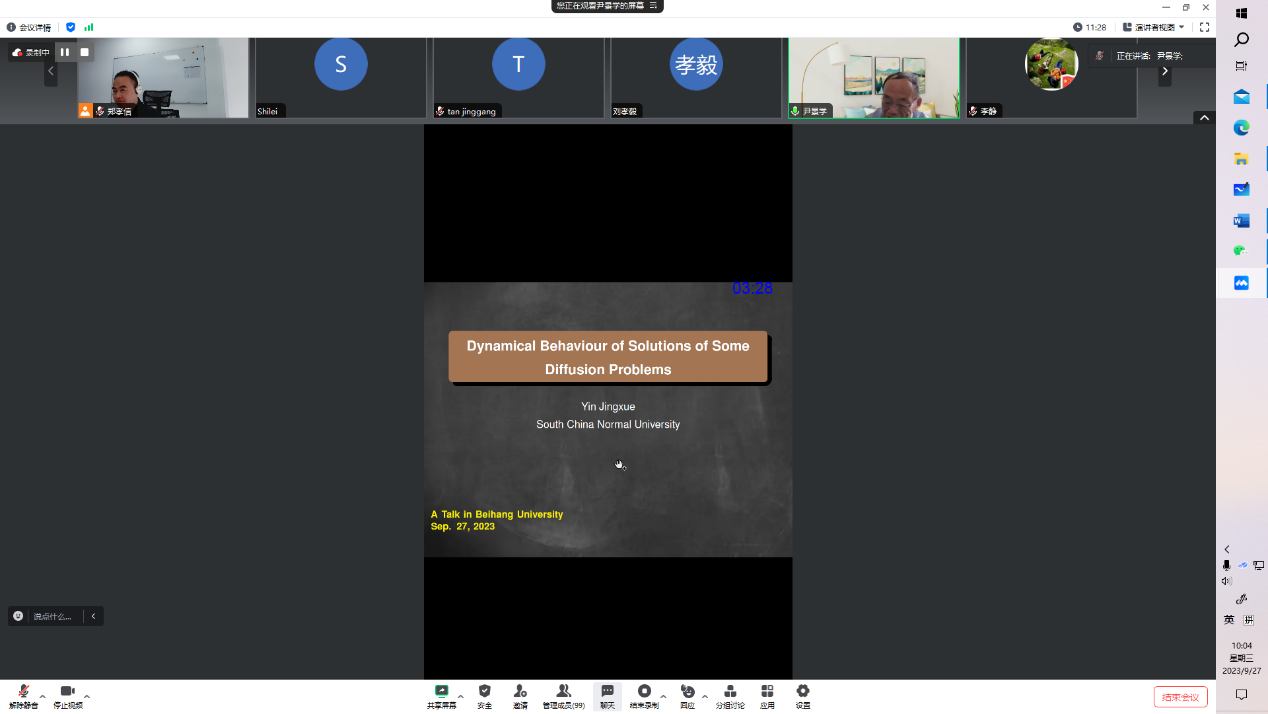 2023年9月27日上午,华南师范大学尹景学教授应邀为beats365亚洲体育投注师生做了题为 “Dynamical Behaviour of Solutions of Some Diffusion Problems”的学术报告。 此次报告由应用数学系郑孝信老师主持,相关研究领域的师生参加了本场报告。