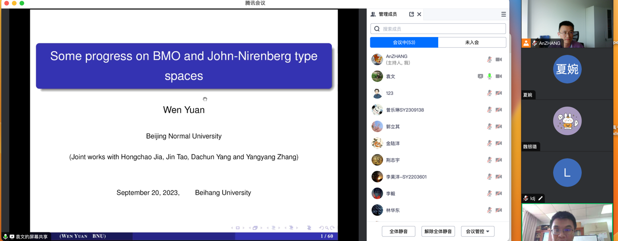 2023年09月20日,北京师范大学袁文教授,应邀为beats365亚洲体育投注师生做了题为 “Some progress on BMO and John- Nirenberg type spaces”的学术报告。报告由张安老师主持。