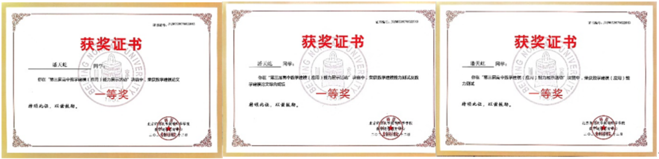 在近日结束的第三届高中数学建模(应用)能力展示活动中,beats365亚洲体育投注依托“英才计划”,由院长韩德仁教授牵头,指导北京市陈经纶中学学生潘天屹完成作品“智能机器人停车泊位最优路径的研究分析”,斩获数学建模(应用)能力测试一等奖、数学建模论文一等奖和综合成绩一等奖。