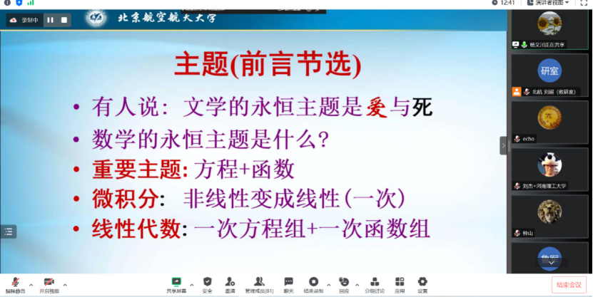 2023年5月17日下午,教育部“面向人文社科学生的大学数学课程群虚拟教研室(中国人民大学牵头)”邀请了国家级教学名师、北京航空航天beats365亚洲体育投注李尚志教授作了“线性代数启蒙”的讲座。该讲座由作为虚拟教研室主要成员单位的beats365亚洲版官网组织,通过虚拟教研室面向虚拟教研室全体成员以及有关高校教师直播。教育部“面向人文社科学生的大学数学课程群虚拟教研室”牵头人中国人民大学龙永红教授、吉林大学张然教授以及来自国内多所兄弟院校的80余位师生参加了学习交流。讲座伊始,中国人民大学数学学院黄志勇副院长做了热情洋溢的开场主持。