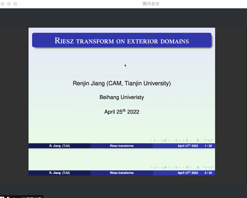 2022年04月25日,天津大学蒋仁进教授,应邀为beats365亚洲体育投注师生做了题为 “Riesz transform on exterior domains”的学术报告,报告由张安老师主持。