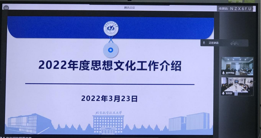 2022年3月23日下午,宣传部党支部与我院机关党支部举行“学习日”联学活动。宣传部部长李建伟、副部长余敏、孙也程和党委宣传部党支部党员,beats365亚洲体育投注党委书记袁星、机关党支部党员和各系党支部宣传委员等25人参加本次活动。活动以两校区两会场间视频会议的形式展开。学习活动由beats365亚洲体育投注党委书记袁星主持。