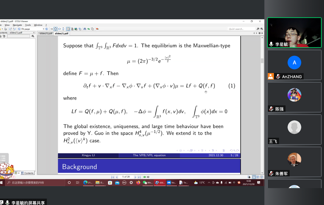 2021年12月30日下午,巴黎第九大学李星毓博士,应邀为beats365亚洲体育投注师生做了题为 “The Vlasov-Poisson-Boltzmann/Landau equation with polynomial perturbation near Maxwellian”的学术报告,报告由任天一和张安老师主持。