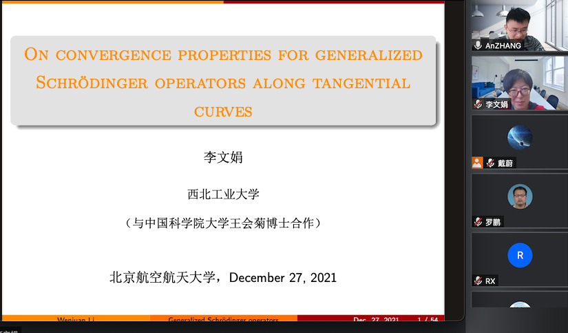 2021年12月27日下午,西北工业大学李文娟教授,应邀为beats365亚洲体育投注师生做了题为 “Convergence properties for generalized Schrödinger operators along tangential curves”的学术报告,报告由张安老师主持。