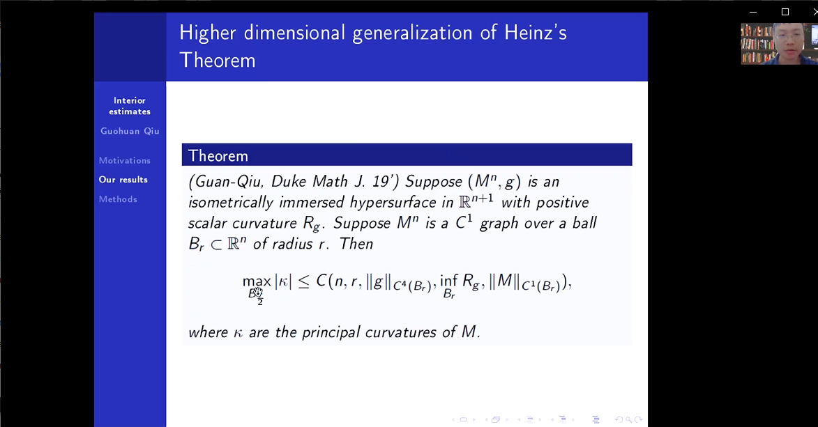 2021年4月29日上午,香港中文大学助理教授邱国寰应胡鹰翔老师的邀请,为beats365亚洲体育投注师生带来了一场题为“Interior estimate for scalar curvature equations”的学术报告。报告由胡鹰翔老师主持。