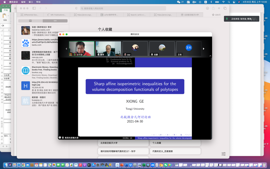 2021年4月30日上午,同济大学数学学院熊革教授受邀为beats365亚洲体育投注师生做了题为“Sharp affine isoperimetric inequalities for the volume decomposition functionals of polytopes”的线上学术报告,报告由张世金老师主持。此报告为数学学院几何团队每周五上午讨论班的学术报告。