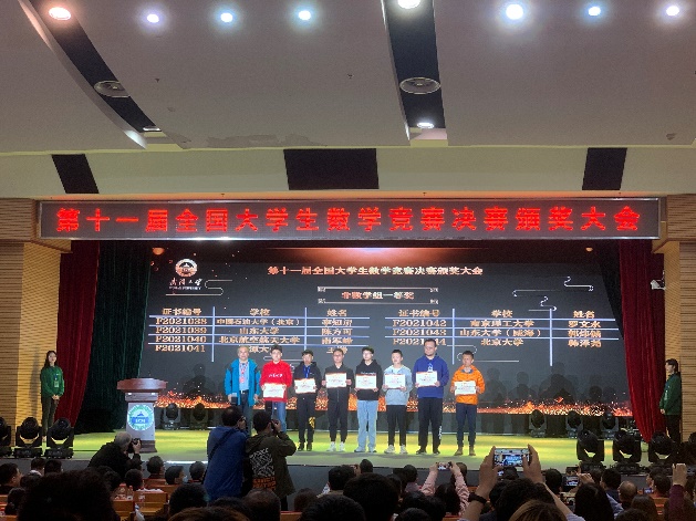 2021年4月18日,因新冠疫情延期举行的第11届全国大学生数学竞赛决赛于武汉大学成功举行。我校共有6名同学入围本次决赛,全部在决赛中斩获奖项。在数学类决赛中,黄文欢、李佳磊两位同学分别获得一等奖、二等奖;在非数学类决赛中,我校南军锋同学获得一等奖,武东弋、陈宇轩同学获得二等奖,韩程凯同学获得三等奖。