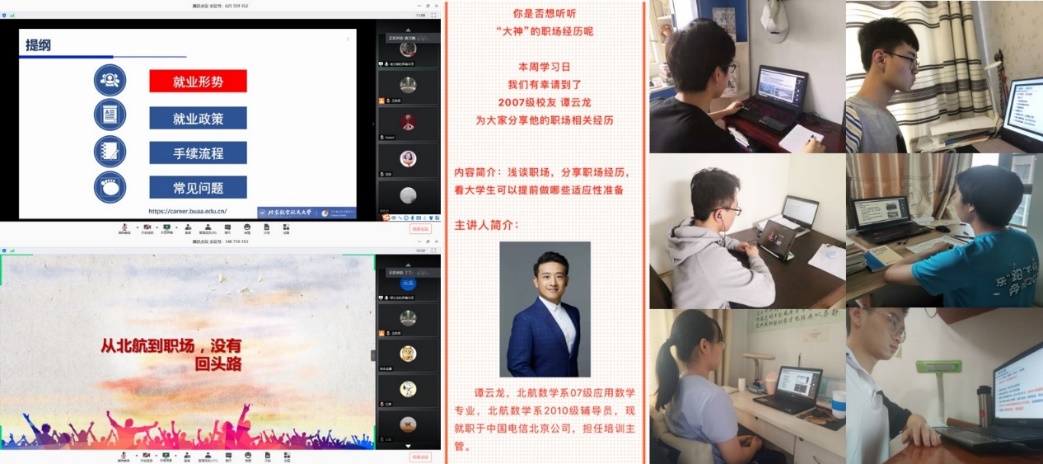 学院本科2007级校友、北京电信公司培训主管谭云龙为同学们做《从北航到职场,没有回头路》主题在线讲座,结合自身求职经历和人力资源工作经验,为同学们讲述如何做职业选择、行业选择及岗位选择,分析数学专业的优势就业方向,以及分享如何制作简历、如何面试等具体求职技巧,并向同学们提出做好自我认知、磨练个人技能、加强实习实践的就业准备建议。