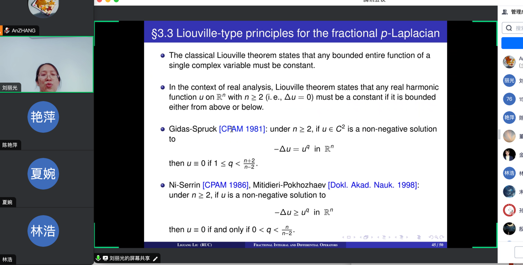 本次报告,陈老师介绍了带粗糙核的振荡型奇异积分算子的弱(1,1)有界性,先回顾了相关经典的奇异积分估计和相关参考文献,然后研究了带振荡型的奇异积分算子的端点有界性和其他指标的插值估计。刘老师介绍了分数次积分和微分算子相关的最新结果,在回顾了主要的历史背景后,研究了限制性准则和相关微分方程解的正则性以及函数空间的重要性质。