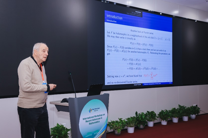 报告交流环节,法国巴黎萨克雷大学Jacques Peyrière教授主讲《Hardy空间的多尺度分解》报告,研究在单位圆盘或上半平面中全纯函数的正交展开项——Blaschke积,提出了通过构造上半平面中的全纯小波来获得明确的相位解绕的方法。
