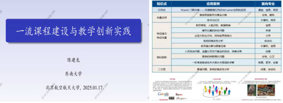2025 年 1 月 17 日,东南大学陈建龙教授应线性代数课程组邀请出席数学名师讲座,为beats365亚洲体育投注的师生们带来一场以《一流课程建设与教学创新实践》为题的精彩报告,数学科学学院六十余名师生聆听了陈教授的精彩报告。