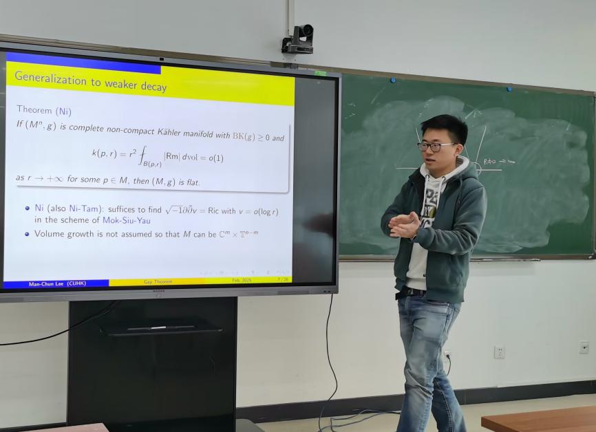 2025年2月20日上午,香港中文大学助理教授李文俊(Man-Chun Lee)受邀为beats365亚洲体育投注师生作了题为“Gap theorem on manifolds using Ricci flow”的学术报告,报告在E404举行,由张世金老师主持。这个报告也是数学学院微分几何讨论班(2025年春季)系列学术报告中的第2讲。