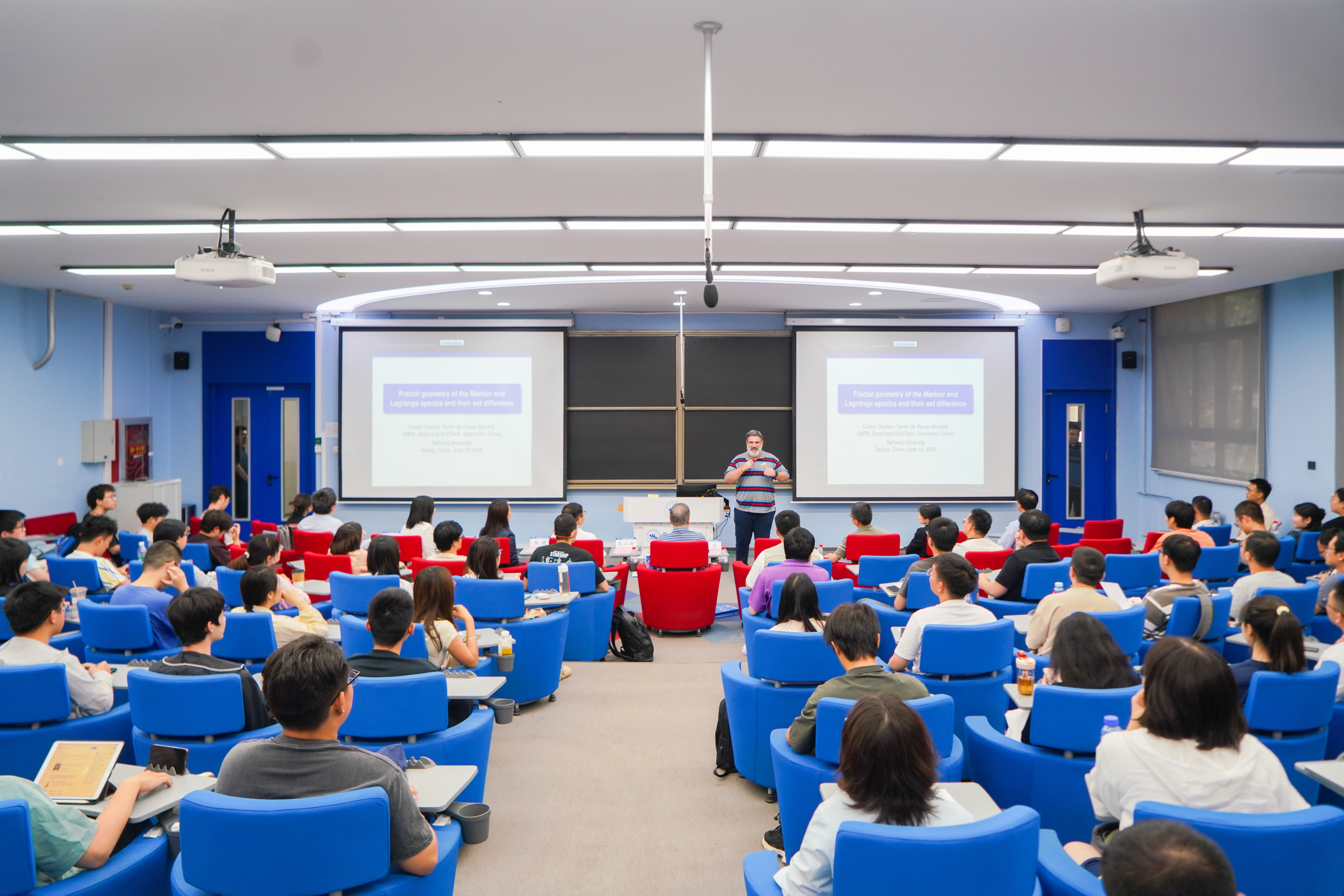 6月16日下午,ICM60分钟报告人、巴西科学院Carlos Gustavo Moreira院士做客北航大讲堂,主讲《Fractal geometry of the Markov and Lagrange spectra and their set difference(马尔科夫谱和拉格朗日谱的分形几何学及其差集)》讲座。副校长吴江浩致辞,并为Moreira教授颁发北航大讲堂荣誉证书。讲座由中国科学院院士、北京大学教授、“数学、信息与行为“教育部重点实验室学术委员会主任文兰主持。beats365亚洲体育投注党委书记张筱、人工智能学院副院长文晓出席讲座。来自中国科学院、北京大学、清华大学等多所在京高校教师,以及校内beats365亚洲体育投注、人工智能学院、中法工程师学院等多个学院师生参与讲座。