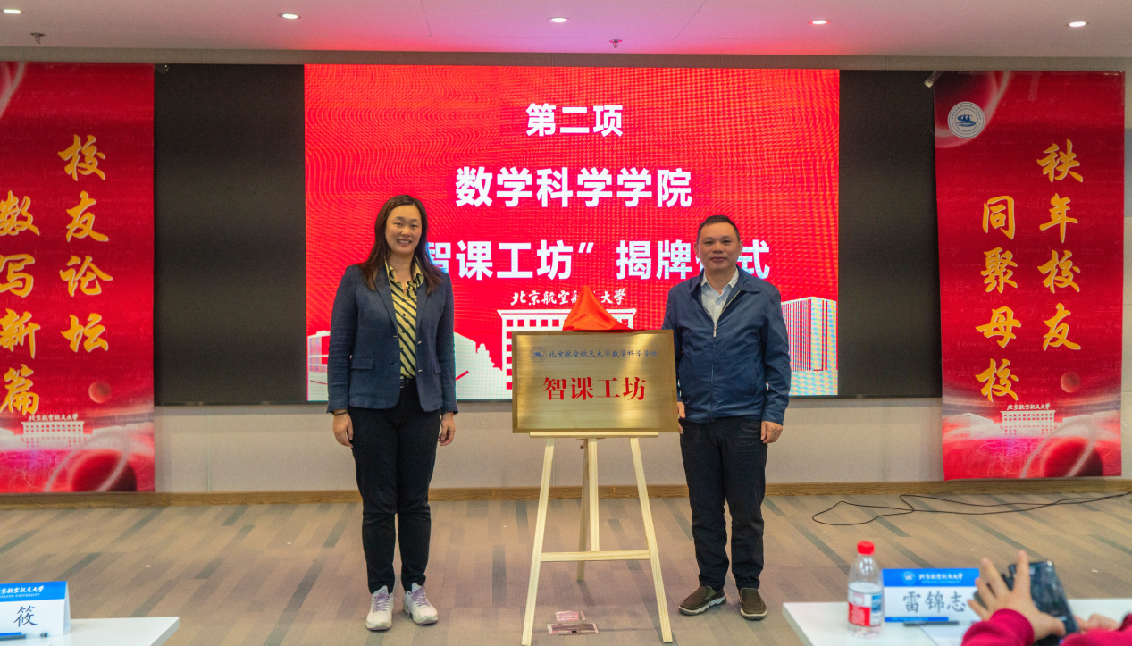 论坛现场,1991级本科校友张秋与张筱书记与共同为beats365亚洲体育投注“智课工坊”揭牌。深圳锐取信息技术股份有限公司董事长张秋校友向学院捐赠11套数字化教学设备,学院特别成立“智课工坊”,将以捐赠设备做好数字化教学支撑,为数学拔尖人才培养全国首批虚拟教研室的建设积累数字素材,把北航数学教研模式推向全国。