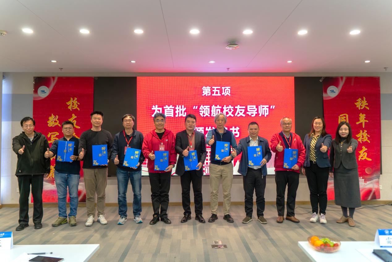 论坛尾声,学院为首批“领航校友导师”颁发聘书并合影。希望将数学学院的关怀与力量代代相传,让校友的宝贵经历成为学弟学妹成长路上的 “指路明灯”,助力 “数学人” 接续成长。